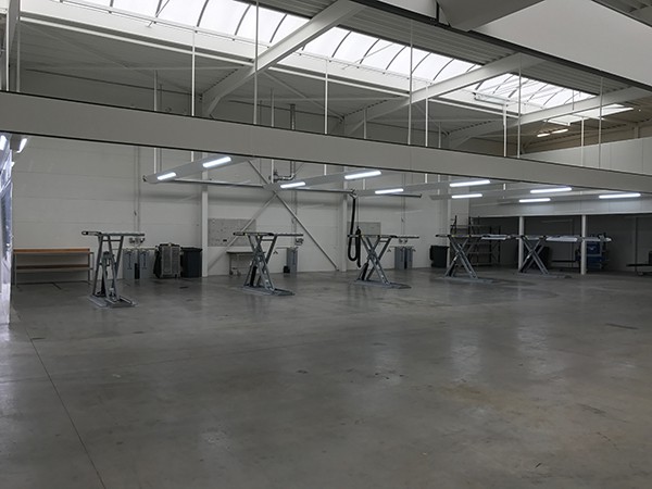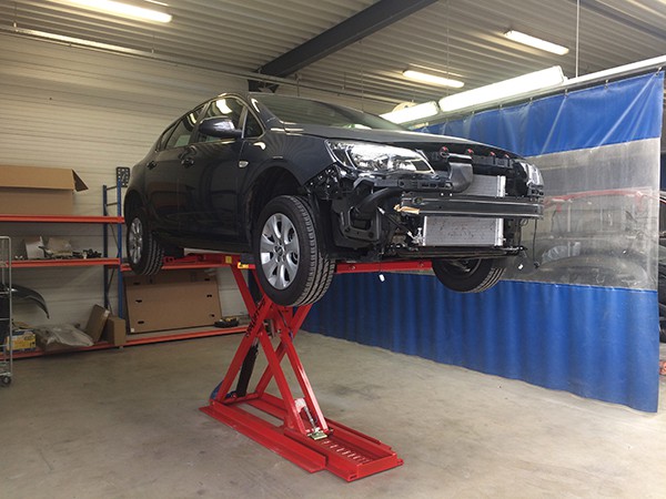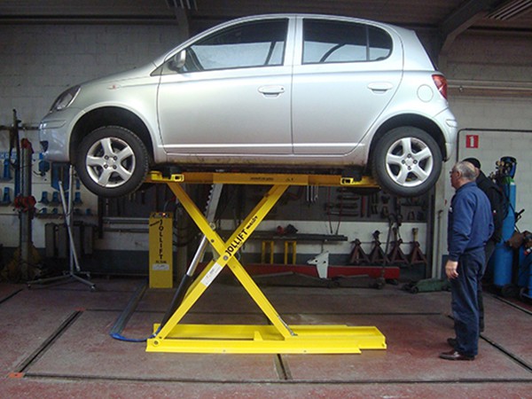 La tôle de base est construite solidement avec des profils-L de 10 mm d’épaisseur. De cette façon on peut utiliser le pont mobile et l’ancrage au sol n’est pas nécessaire. Les bras de levage ciseaux sont construits en acier massif de 35 x 80 mm et sont animés par un piston hydraulique. Quand l’élévateur est fermé, il n’a que 10,5 cm d’hauteur.
