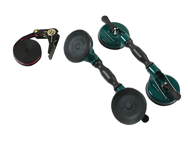 Double ventouse avec poignée et sangle de fixation, avec poignées flexibles pour une meilleure adhérence au verre curvé. 2 poignées de ventouse, chaque poignée équipée de ventouses d’un diamètre de 2 x 117 mm pour plus d’adhérence et de charge utile.
