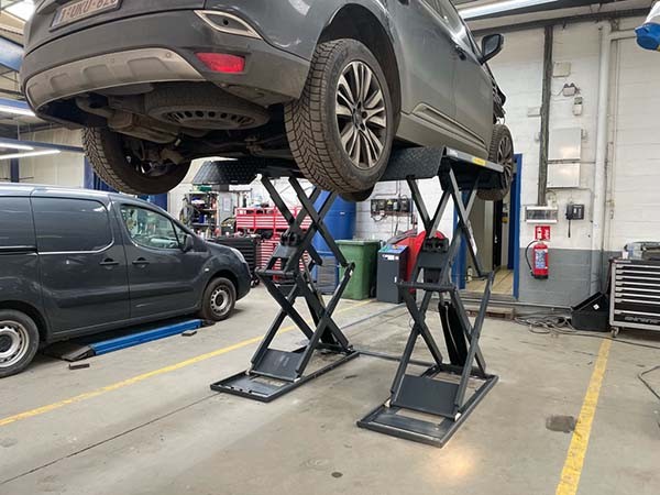 Nieuwe installatie van 2 dubbele schaarhefbruggen, met minimale overrijhoogte van 116 mm, maximale hefhoogte 1,9 m en hefvermogen van 3,0T. Deze bruggen zijn voorzien van een extra set wielplaten om de overrijhoogte te beperken.
