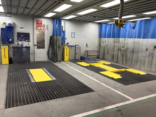 Nieuwe installatie van 2 FiTim Jollift 1200 hefbruggen. De bruggen werden gekozen omwille van hun vlakke inwerking in de roostervloer en de veelzijdigheid. Het is namelijk mogelijk om beide bruggen te voorzien van wielopname.