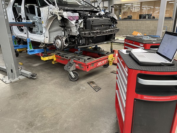 Deze Volkswagen ID3 werd op de Celette richtbank geplaatst, voorzien van de universele richtmallen "Cameleon".